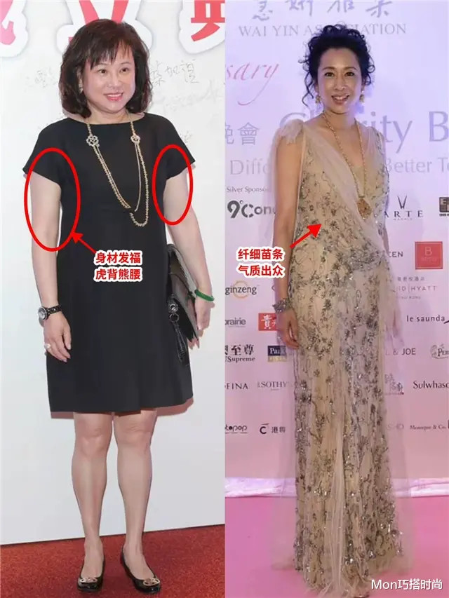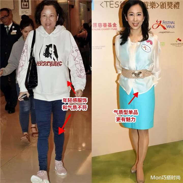 看下面的对比就知道,穿太年轻化、休闲风的衣服真的很难凸显成熟女性的魅力,更建议大家选一些有质感、显贵气的优雅感服饰。