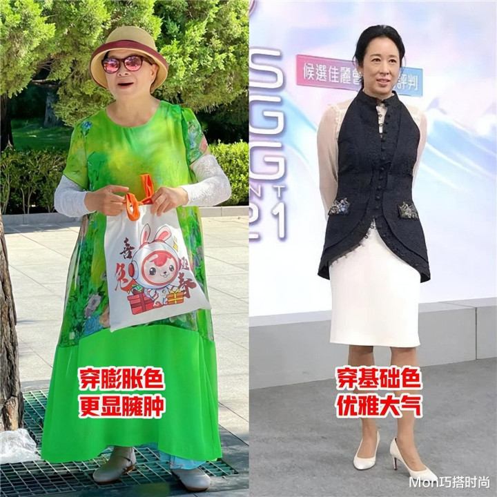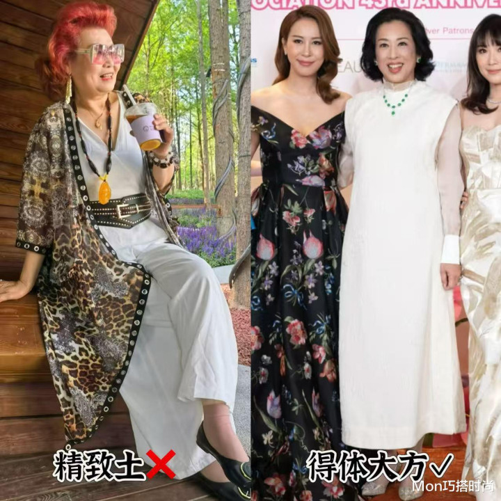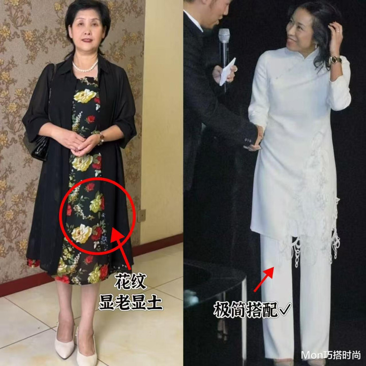 打开妈妈们的衣柜,我相信大家总能找到几件印满大花、大牡丹的衣服,大红大紫的花色看着就很俗气,穿在中老年的阿姨们身上,无疑是把咱们的俗气品味暴露出来,花色不对还会显得肤色暗沉,年龄感瞬间就上去了;再看朱玲玲的打扮,干干净净,不整那些花里胡哨的,是不是有气质多了?