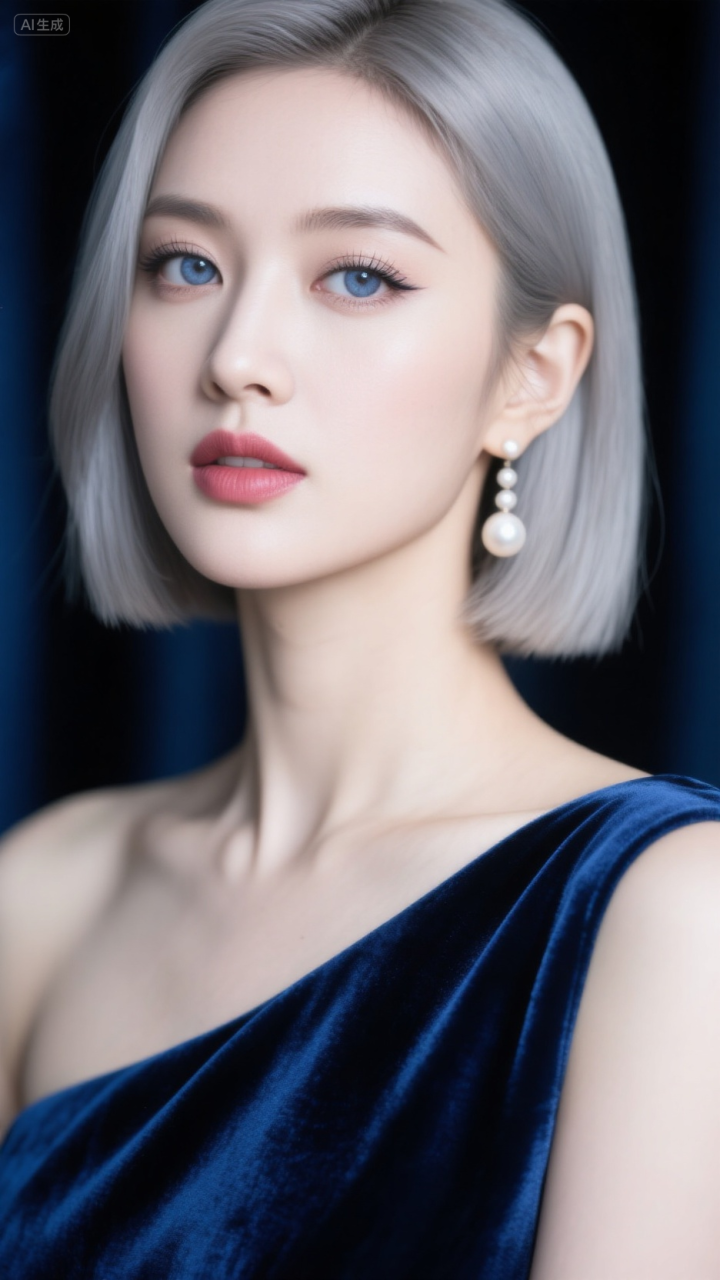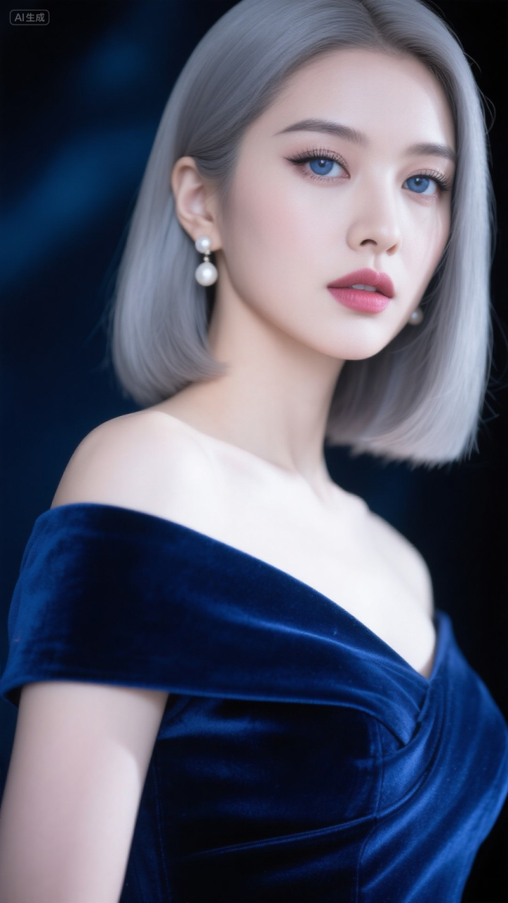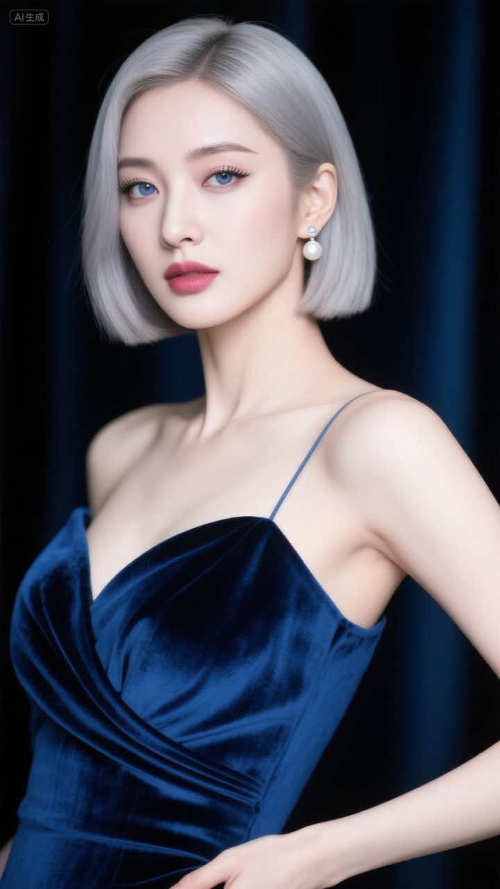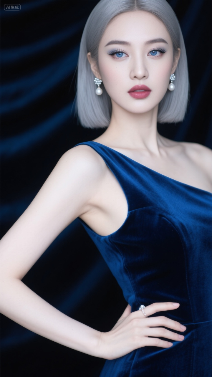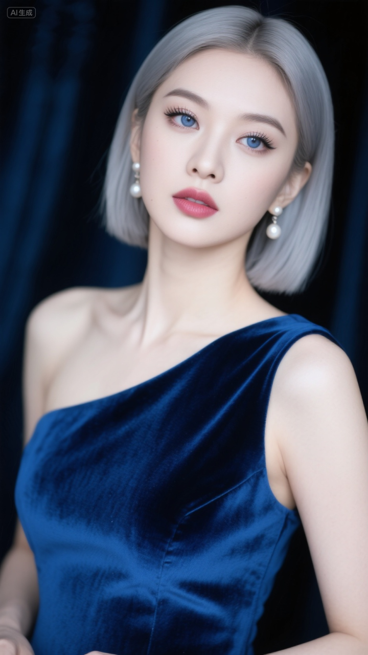 网上在线配资炒股公司银灰短发冷艳御姐: 深蓝丝绒露肩裙, 星芒眼超魅惑