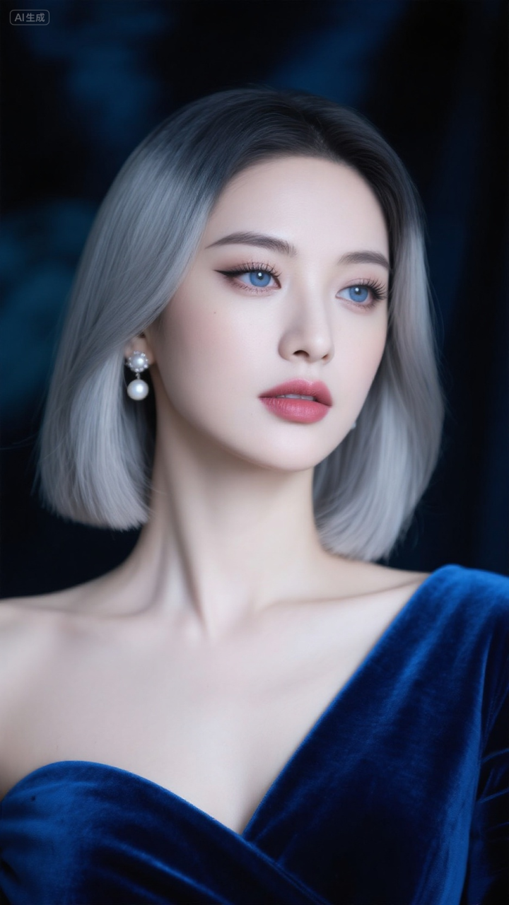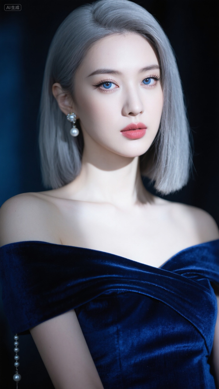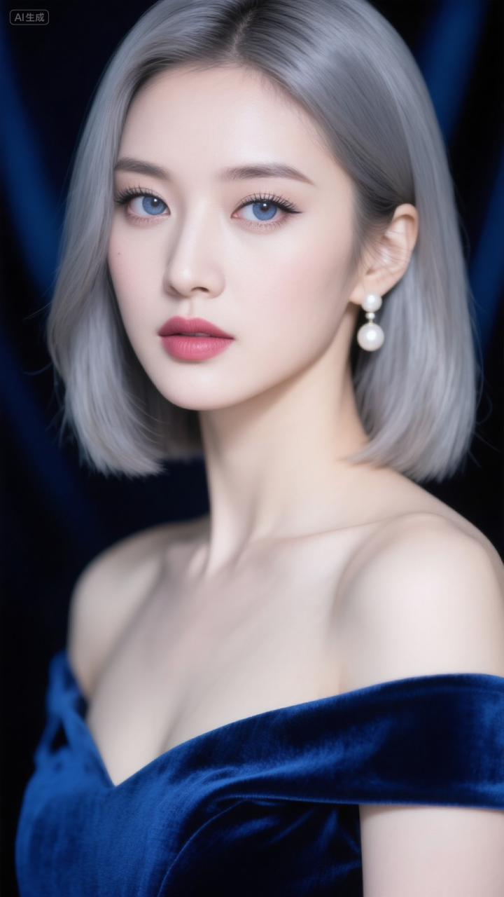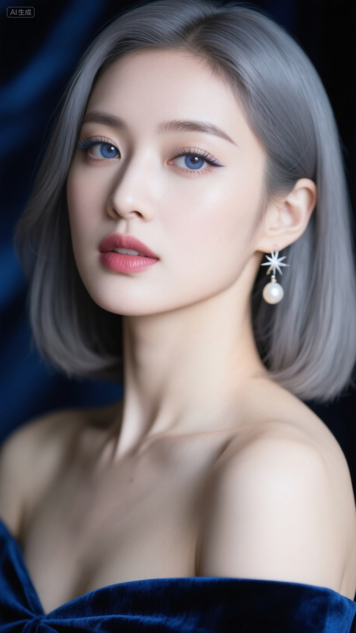 网上在线配资炒股公司银灰短发冷艳御姐: 深蓝丝绒露肩裙, 星芒眼超魅惑
