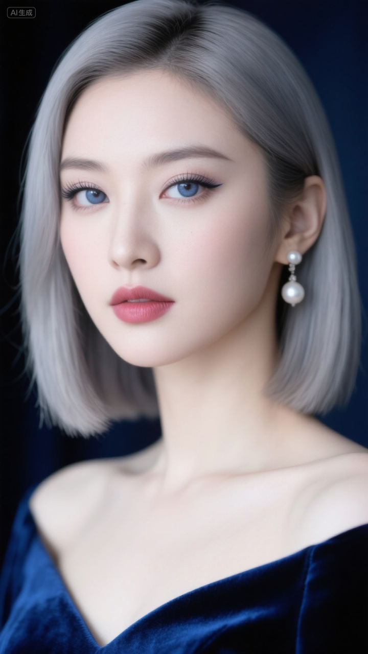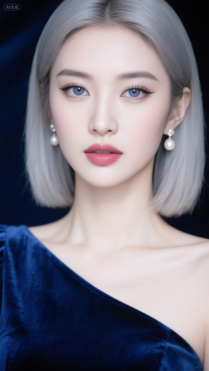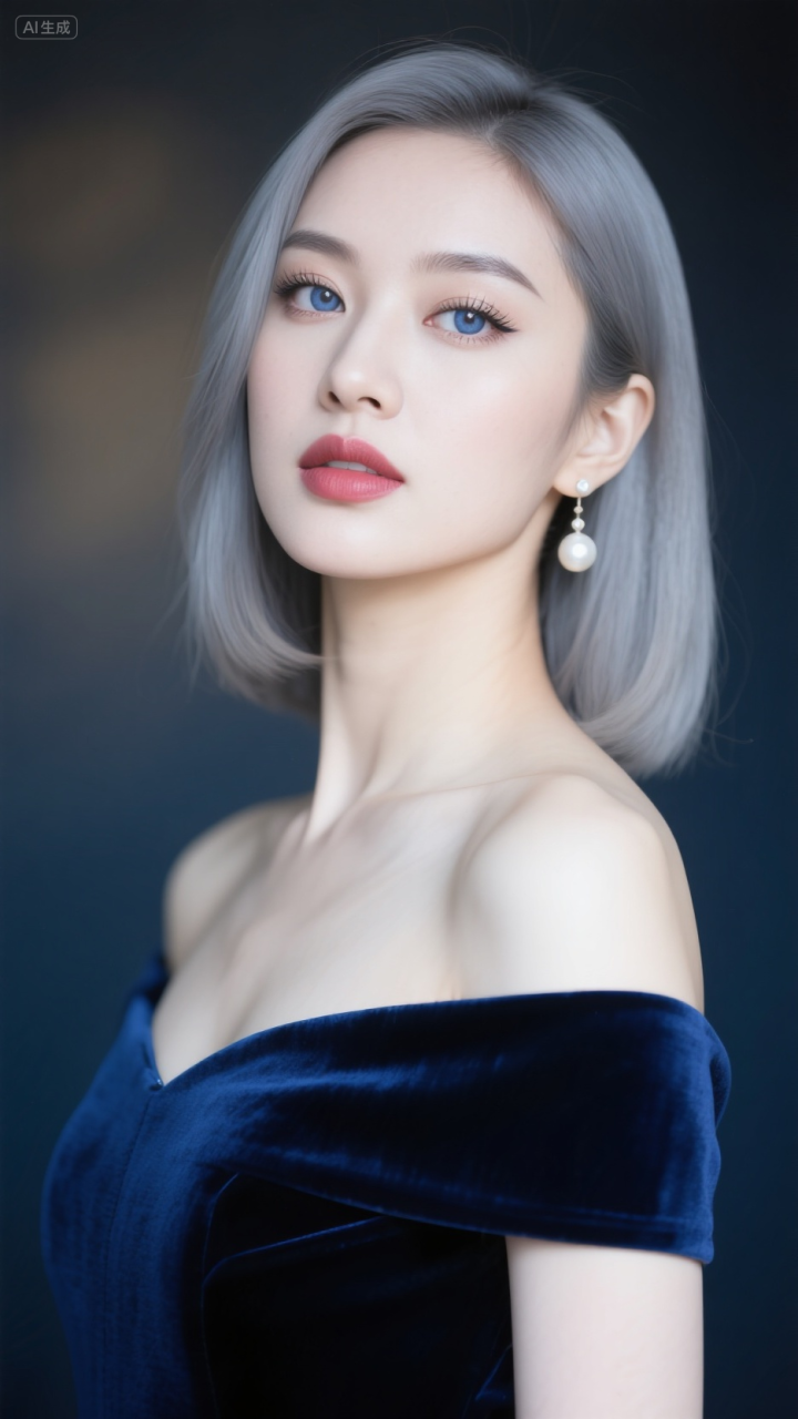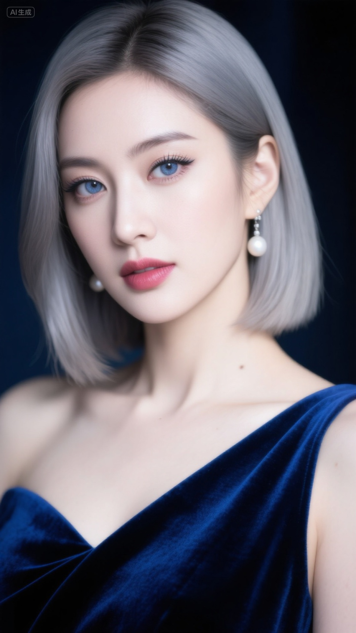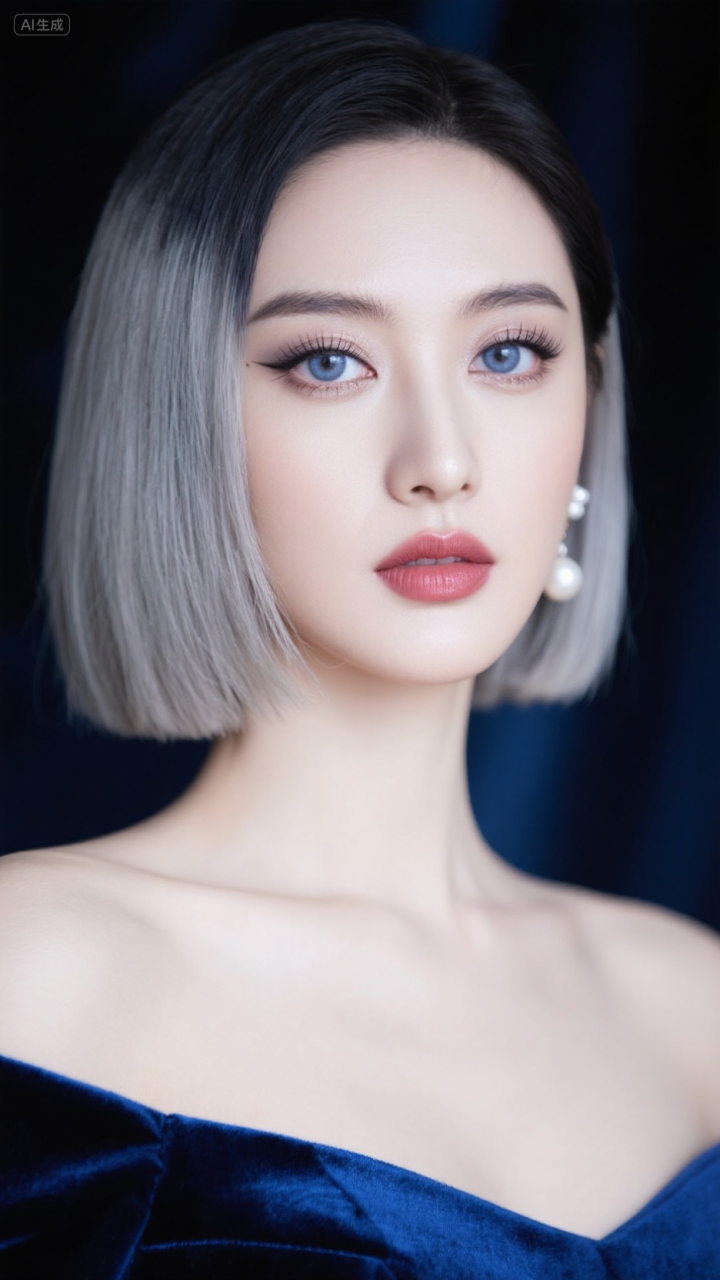网上在线配资炒股公司银灰短发冷艳御姐: 深蓝丝绒露肩裙, 星芒眼超魅惑